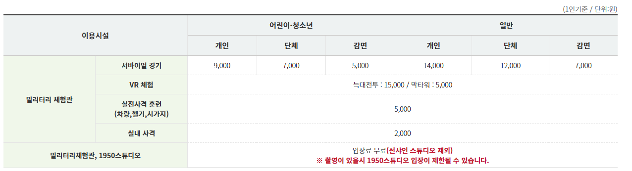 # 체험 - 서바이벌 체험장, 밀리터리 체험장, 1950 스튜디오